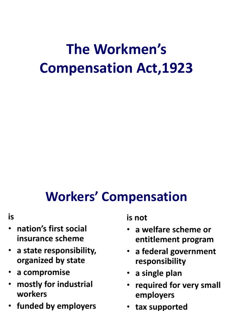 The basis of workmen s compensation act 1923 passed in march 1923 and was put into force on 1st july 1924 is that the state government cannot be a silent spectator to the suffering of the working class engaged in factories or establishments who are exposed to the various risks to their limbs and lives.